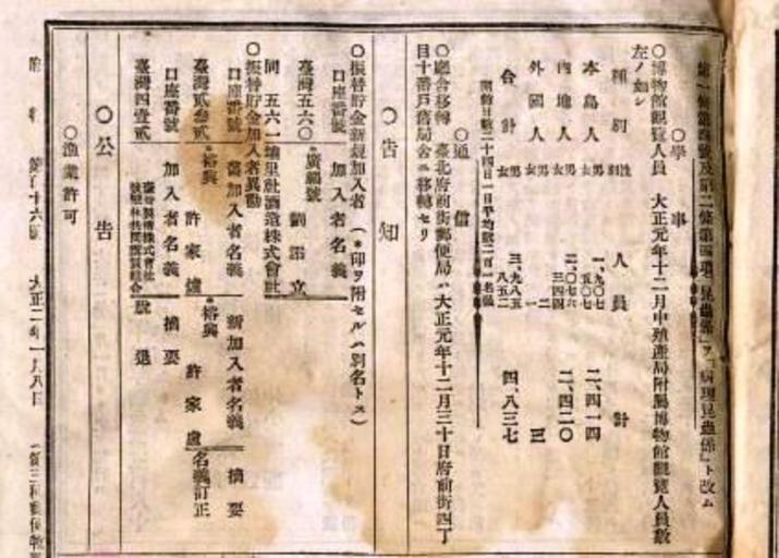 | Keywords: 1913 January Gazette of the Governor-General of Taiwan 大正2年1月臺灣總督府報-博物館觀覽人數.jpg zh-tw 1913-01-08 大正元年十二 附屬於殖產 底下之博物館 覽人數統計 2013-10-14 09 30 22 http //catalog digitalarchives tw/item/00/49/0c/2a html Japanese Government PD-Japan-exempt<br>PD-ROC-official Officail text of Government-General of Taiwan Uploaded with UploadWizard Collections of the National Taiwan Museum PD-Japan-exempt PD-1996 Japan | ||||