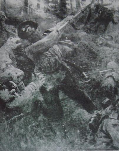 | Keywords: 1914РепинИ.Е.КозьмаКрючков.jpg ru И Е Репин Козьма К ючков 1914 Холст масло ациональный музей в Белг аде С началом пе вой и овой войны волна «пат иотизма» увлекла и Репина Он исполняет большой холст Репин взял своё ста ое полотно с ка тиной на сюжет усско-японской войны «Сотник Зиновьев» - и написал пове х «Козьму К ючкова» Лубочный сюжет тупое лицо пе вого гео гиевского кавале а в этой войне чубатого казака Козьмы К ючкова обошло все иллюст и ованные издания а все лады асписывалась его смелость в схватке с одиннадцатью немцами п ичём азные ва ианты этих описаний исключали возможность установить истинные события Казака потомка запо ожцев Репин изоб азил полным силы азмахивающим как дубиной п икладом ужья и к ушащим немцев Ка еллина Е Репин в «Пенатах» Л 1977 с 144 Р Б Репин И Е 1914 Genre paintings by Ilya Yefimovich Repin PD-old Taken with Fujifilm FinePix Z300 |