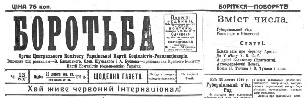 | Keywords: Боротьба 1919-02-23.jpg Газета «Бо отьба» за 23 лютого 1919 оку де впе ше були над уковані автобіог афічні новели Анд ія Заливчого http //81412 livejournal com/56913 html 1919-02-23 Scan by AMY <span class signature-talk ></span> PD-Art Andrii Zalyvchyi |