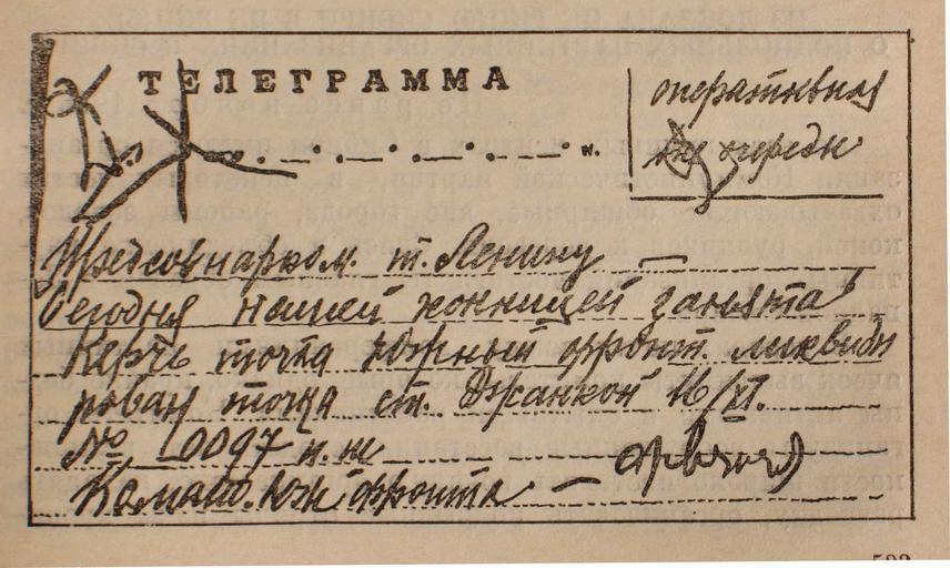 | Keywords: Телеграмма Фрунзе Ленину 1920.JPG Operational telegram from bolshevik military commader Mikhail Frunze to Vladimir Lenin regarding the capture of Kerch-Peninsula and the liquidation of the southern front of Russian Civil War ru Опе ативная телег амма Ф унзе Ленину о взятии Ке чи и ликвидации Южного ф онта п отив В ангеля own photo by Vizu / В огненном кольце Исто ия Отечества в оманах и документах олодая гва дия 1988 Раздел документов Mikhail Frunze 1920-11-16 PD-trivial signature Russia PD-old-70 Signatures of politicians from the Soviet Union Signatures of generals from Russia Mikhail Frunze 19201116 Documents in Russian Civil war of Russia in Crimea 19201116 History of Kerch 1920 in Crimea telegramms Civil war of Russia 1920 |
