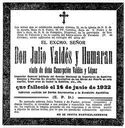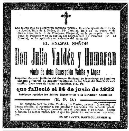 | Keywords: 1922-Julio-Valdes-y-Humaran.jpg  es Esquela primer aniversario de Don Julio Valdès y Humaran viudo de Doña Concepcion Valdès y Lopez Inspector General jubilado del Cuerpo Nacional de Ingenieros de Camino Canales y Puertos Ex Director facultativo de las Obras del Puerto de esta capital Barcelona Gran cruz de Isabel la Catolica etc etc que falleciò el 14 de junio de 1922 1923-06-14 La Vanguardia Barcelona 14-6-1923 página 3 Julia Valdès y de Pastor Las misas que se celebraran mañana viernes 15 en la iglesia de N S de la Ayuda Baja de San Pedro 18; PP Camilos Baja de San Pedro y de diez a doce en N S de Pompeya Diagonal en la parroquia de San Juan de Palamos y en la capilla del Sacramento de Palamos P de Gerona seran aplicadas en sufragio del alma del El Excmo Señor Don Julio Valdes y Humaran Viudo de doña Concepcion Valdes y Lopez Inspector General jubilado del Cuerpo Nacional de Ingenieros de Caminos Canales y Puertos Ex director facultativo de las Obras del Puerto de esta capital Gran cruz de Isabel la Catolica etc etc Que falleciò el 14 de junio de 1922 Habiendo recibido los Santos Sacramentos y la Bendicion Apostolica - - - - - E P D - - - - - Su apenada sobrina Julia Valdes y de Pastor primos ausentes y demas familia al recordar a sus amigos y conocidos tan sensibile perdida les suplican le tengan presente en sus oraciones y se sirvan asistir a alguna de dichas misas por lo les quederan sumamente agradecidos No se invita particularmente PD-old Julio Valdès y Humaran Obituary La Vanguardia obituaries 1922 1922 obituaries of Spain Uploaded with UploadWizard ImageNote 1 93 186 787 710 960 979 2 Las misas que se celebraran mañana viernes 15 en la iglesia de N S de la Ayuda Baja de San Pedro 18; PP Camilos Baja de San Pedro y de diez a doce en N S de Pompeya Diagonal en la parroquia de San Juan de Palamos y en la capilla del Sacramento de Palamos P de Gerona seran aplicadas en sufragio del alma del El Excmo Señor Don Julio Valdes y Humaran Viudo de doña Concepcion Valdes y Lopez Inspector General jubilado del Cuerpo Nacional de Ingenieros de Caminos Canales y Puertos Ex director facultativo de las Obras del Puerto de esta capital Gran cruz de Isabel la Catolica etc etc Que falleciò el 14 de junio de 1922 Habiendo recibido los Santos Sacramentos y la Bendicion Apostolica - - - - - E P D - - - - - Su apenada sobrina Julia Valdes y de Pastor primos ausentes y demas familia al recordar a sus amigos y conocidos tan sensibile perdida les suplican le tengan presente en sus oraciones y se sirvan asistir a alguna de dichas misas por lo les quederan sumamente agradecidos No se invita particularmente ImageNoteEnd 1 |