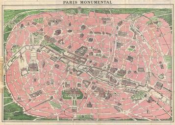 Keywords: 1927 Leconte and Joly Map of Paris, France w- Monuments - Geographicus - ParisMonumental-lecontejoly-1926.jpg This is an extremely attractive 1926 tourist pocket map of Paris France Covers the old walled city of Paris and the immediate vicinity Important buildings are shown in profile including the Eiffel Tower the Arc de Triomphe Sacre-Coeur the Pantheon and others Shows both the train and Metro lines throughout the city This map was issued in various editions from roughly 1900 to 1937 Though most examples are undated we can assign an approximate date due to the development of the Metro system and the map's overall style and construction Attached to original red paper booklet which is itself split at spine A similar map of the greater Paris environs appears on the verso Published by L Joly and A Leconte of 15 Quai Saint-Michel Paris 1926 undated Size in 22 5 16 object history credit line accession number ParisMonumental-lecontejoly-1926 Joly L and Leconte J <i>Plan Commode de Paris avec L'itineraire des Autobus Tramways Metropolitain</i> 1926 Geographicus-source PD-art Maps of Paris in the 20th century 20th-century maps of Paris Maps of landmarks in Paris 1926 maps 1926 in Paris |