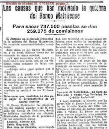 | Keywords: 1931-Banco-Matritense-quiebra-a 01.jpg it Le Cause che hanno provocato il fallimento del Banco Matritense 1931-01-07 El Heraldo de Madrid 7 1 1931 pag 2 El Heraldo other versions El Heraldo de Madrid 7 1 1931 pag 2 Las causas que han motivado la quiebra del Banco Matritense Para sacar 737 500 pesetas se dan 259 375 de comisiones El Juzgado ha declarado la quiebra del Banco Matritense Se exigiran responsabilidades criminales Algo sabia yo del Bano Matritense y en estas ultimas horas me he enterado de otras muchas - Y que impresion saca usted de todo esto “ nos decia una de las victimas como resumen de larga conversacion- - Amigo mio que quiera que le diga Sonrei y el quedo serio y dolorido Cadauno mirabamos la quiebra desde un distinto angulo visual El se acordaba de su dinero Yo pensaba en los pintorescos episodios de una singular novela cuyo ultimo capitulo se recitarĂ en los Tribunales Ocho casa que vendidas no dan para pagar el arrendamiento de un quarto interior El Banco Matritense fue proprietario del edificio numero 5 de la avenida del Conde de Penalver nd r actual Gran Via 22 donde se hallaban instaladas sus oficinas Disfrutaba tambien de la propriedad de las siguentes fincas - Lagasca numero 126 - Santa Engracia 107 - Una casa en Cordoba actualmente de la sucursal del Banco Espanol de Credito - Otra asa en Alcazar de San Juan - Otra en Jaen - Otra en Lucena - Dos en el Puerto de Santa Maria Esto fue el ano 1923 En la actualidad las oficinas estan instaladas en un oscuro cuarto interior de la casa numero 6 de la calle Nueva del Este en el extrarradio que tiene senalado ocho duros mensuales de arrendamiento y cuyos recibos hace tiempo que no se pagan Con el Banco Matritense se albergan la Sociedad de Credito Industrial y La Agricola Industrial de Mostoles sus filiales De todo el negocio queda la realidad de un cuarto oscuro unos libros de actas y un monton de documentos Alarma entre cuentocorrentistas “ Sispension de pagos “ Un convenio con los acreedores A fines del ano 1922 y principios del 23 cierta revista financiera hacia camapana sobre la situacion economica del Banco Matritense Presentaros los cuentacorrentistas a retirar fondos y el Baco tuvo que declararse en suspension de pagos Entonces funcionaba en Madrid una Sociedad dedicada a la compra y venta de antiguedades instalada en la calle de Jardines en cuyo negocio tenia partecipacion el director de la revista Esta Sociedad de compraventa se titulaba Casa de Comision y Venta Se nombraron interventores judiciales y a los interventores sucedio un Consejo a base de los directores de las sucursales de provincia que duro unos cuatro meses El Cosejo fue sustituido por otro Fueronse renovanndo los consejeros por sucesivas dimisiones El Banco habia llegado a pactar un convenio con sus acreedores que consistia en vender todos los bienes para saldar la integridad de los creditos en seis anualidades La formula era la siguente se pagaria el 15 por 100 cada uno de los cuatro primeros anos y el 20 por 100 cada uno de los dos restantes Y concretaba el convenio se garantia el pago de los dos primeros anos con el importe de la venta de los immuebles Esos immuebles eran los que hemos dicho antes El Consejo empezò a vender casas Interpretando el convenio no reservo los 15 y 20 por 100 establecidos sino el 30 por 100 correspondientes a las dos primeras anualidade El 60 restante se reservo para negociar libremente Compras de Sociedades “ La Casa de Comision y Venta “ La Sociedad de Credito Industrial Y aqui comienza la historia que ha arrastrado al Banco hasta el domicilio de la calle Nueva del Este Comienza un periodo de pactos mercantiles y ventas El Banco no quiso crear nuovos negocios sino comprarles La Casa de Comision y Venta de la que no era ajeno el animador fundo una entitad titulada Sociedad de Credito Industrial con un capital nominal de 20 millones de pesetas y un desembolso efectivo de 5 000 pesetas El Banco Matritense hizo entonces un contrato con la Casa de Comision y Venta para adquirir la nueva Sociedad La Casa de Comision y Venta estaba dirigida en aquel momento por un primo del director del Matritense El contrato fue el siguente El Banco compro a Casa de Comision y Venta unas 4 000 acciones una de 500 y otras de 250 pesetas nominales por valor total de 1 490 000 pesetas A cambio de que se vendio la Socied Credito Industrial al Banco Pues a cambio de 30 000 acciones que el Banco Matritense dio a la Sociedad Credito Industrial El Banco Matritense se comprometio a pagar los dividendos pasivos que se acordaran a la nueva Sociedad El Credito Industrial iba a dedicarse a la fabricacion de calzado y muebles de madera curvada En resumen 30 000 acciones de Matritense equivalentes a 1 500 000 pesetas nominales cambiaronse por 3960 acciones igual a 1 400 000 pesetas de Credito Industrial Se comenzaron a vender bienes y a la Sociedad Credito Industrial fue acudiendo el dinero que como producto de la venta de fincas obtenia el Banco La Fundacion Mercantil “ La Agricola Comercial de Mostoles Poco despues se fundo otra Sociedad Fundacion Mercantil que luego cambio el nombre por el de Fundacion Mercantil Corporativa Urbana El Banco compro la idea a una persona de Alicante La finalidad social era distribuir coupones en los comercios y construir casas para sortearlas entre los tenedores de tales coupons Y por ulltimo se fundo la Sociedad Agricola Comercial de Mostoles La s relaciones entre el Banco y todas estas filiales fueron agotando el dinero El Matritense tenia un modo original de abrir algunas cuetas corrientes En vez de dpositarse el dinero en el Banco era este quien daba el dinero al cuentacorrentista a cuenta de letras aceptadas Durante los anos 1924 y 1925 se vendieron las casas de Madrid y provincias En enero de 1926 el hasta entonces presidente del Consejo presento la dimision y se quedo en el puesto de presidente de Sociedad Credito Indystrial Habia desempenado antes las dos presidencias Las comisiones de