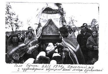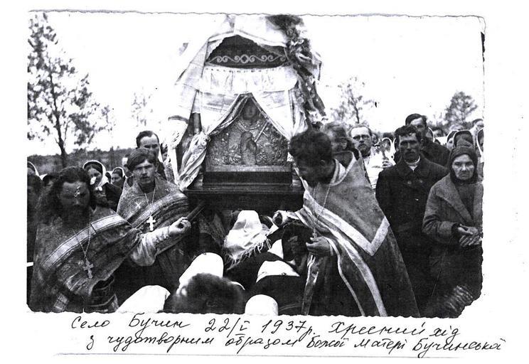 Keywords: Бучин 1937.jpg uk Рестав оване фото 1937 оку Х есного Ходу з Бучинською іконою Божої ате і біля п авославної це кви села Бучин А хів Валентини Шовкун-Кульчинської икола Савчук 1937-05-22 Our Lady of Buchin icon