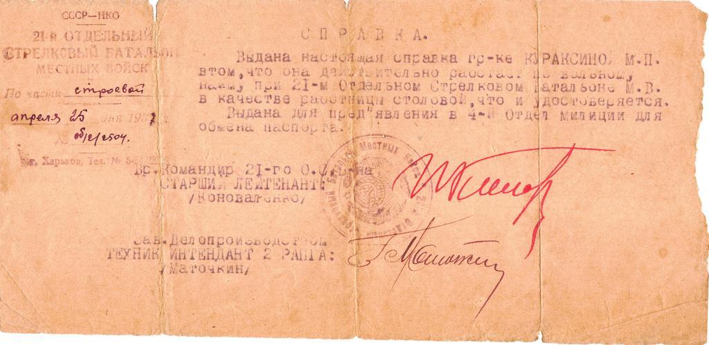 Keywords: 1937 21й осб мв Харьков.jpg USRR Army RKKA in Kharkov document 1937 21-й отдельный ст елковый батальон местных войск осбат м в Ха ьков - бумажная сп авка в 4-й айотдел милиции о аботе по вольному найму 1937 Текст станда тный own scan paper doc by Vizu from collection 1937-04-25 USRR Army RKKA <gallery>File 1937 21й осб мв Ха ьков уш jpg</gallery> PD-old-70 PD-ineligible text PD-Russia-2008 PD-RU-exempt documents USSR coat Documents of Kharkiv Army of the Soviet Union KhVO 1937 in Kharkiv |