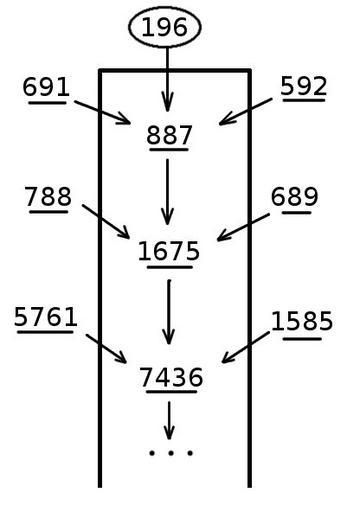 | Keywords: 196 lychrel thread.jpg en This diagram describes the terminology of Lychrel numbers It represents the thread created by the 196 seed through the reverse and add process of Lychrel numbers The underlined numbers are kin numbers of 196 fr Ce diagramme décrit la terminologie des nombres de Lychrel Il représente le fil créé par la graine 196 selon le processus d'inversion et d'addition des nombres de Lychrel les nombres surlignés sont les nombres apparentés à la graine 196 own Jawakaaa 2011 Cc-zero Number theory |