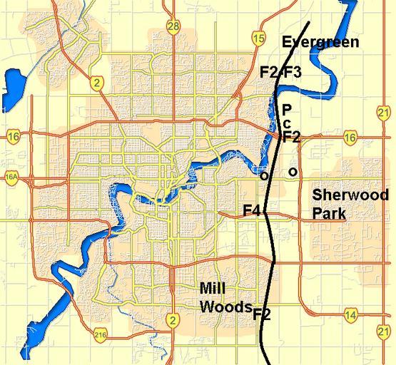 | Keywords: 1987 Edmonton Tornado path.png en Path taken by the F4 Edmonton tornado in 1987 The F numbers are for the Fujita values the O is for Imperial Oil Strathcona and Petro-Canada refineries P is the Edmonton Power Clover power station and C is for the Celanese Canada chemical plant The image is made using File Edmonton_street_map png as the background and data from http //datalib library ualberta ca/tornado/fig2 JPG University of Alberta Atlas of the Edmonton Tornado and Halstorm fr Carte d'Edmonton sur laquelle le trajet de la tornade de 1987 est montré Les F rerpésentent les valeur de Fujita O les deux raffineries de Imperial Oil Strathcona et Petro-Canada P est la centrale électrique de Clover et C est pour l'usine pétrochimique de Celanese Canada L'image est faible avec le fond de File Edmonton_street_map png et les données de http //datalib library ualberta ca/tornado/fig2 JPG University of Alberta Atlas of the Edmonton Tornado and Halstorm own Pierre cb 2010-07-04 1987 Edmonton Tornado |