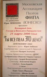 Keywords: 1-й день поэзии UNESCO афиша Театр Таганка 2000.jpg en Aficha 1-j den poezii UNESCO 2000 Taganka teatr Lubimov ru Афиша 1-го дня поэзии UNESCO c моим участием 2000-моя собственность Константин Кед ов Konstantin kedrov moi disk D Konstantin kedrov Konstantin kedrov Константин Кед ов 2000г 21 ма та fail moi Я не воз ажаю п отив публикации и асп ост анением под этой лицензией Константин Кед ов Konstantin kedrov Konstantin kedrov <span class signature-talk >talk</span> 13 40 15 August 2009 UTC Theatre posters of Russia Konstantin Kedrov Taganka Theatre |