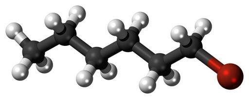 | Keywords: 1-Bromohexane-3D-balls.png Ball-and-stick model of the 1-bromohexane molecule an haloalkane Colour code 505050 Carbon C black<br> F0F0F0 Hydrogen H white<br> B42814 Bromine Br red-brown<br> 2011-02-19 own DS Visualizer Jynto talk Space-filling version cc-zero 1-bromohexane Images by Jynto Ball-and-stick models |