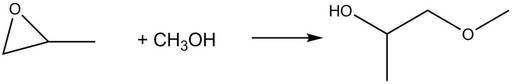 Keywords: 1-methoxy-2-propanol reaction.png propylene oxide + methanol -> 1-methoxy-2-propanol Own 2008-02-07 Klever Public Domain Functional group interconversions Reactions of epoxides Propylene oxide Methoxypropanol