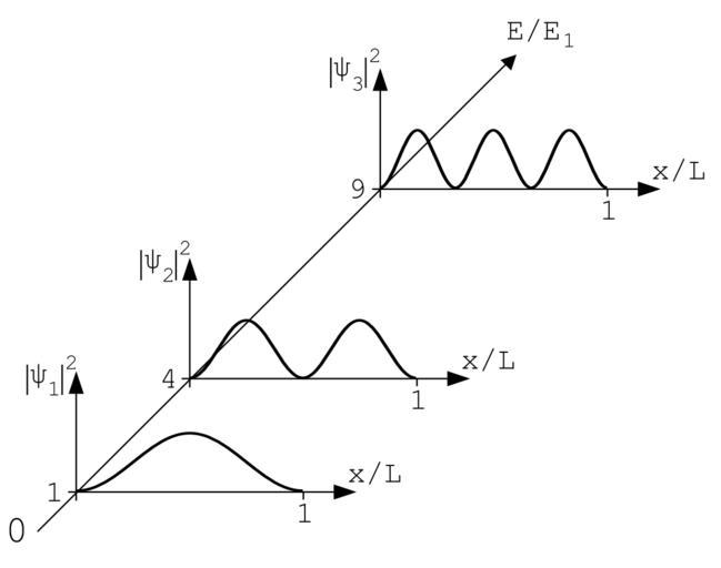 | Keywords: 1D Probability Density with Energies.svg Diagram showing the probability densities of the first 3 energy states in a 1D quantum well of width L Own Drawings done in Inkscape 12/02/07 inductiveload image 1D_Wavefunctions_with_Energies svg Diagram showing the wavefunctions of the first 3 energy states in a 1D quantum well of width L 1D infinite square wells |