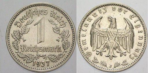 | Keywords: 1ReichsMark.JPG 1 Reichsmark Deutsches Reich 1937 Hamburgische Münze J es Moneda de 1 Reichsmark Nazi German 1 Reichsmark German coin Reichsbank photograph by Turkmenistan 1937 Coin PD-GermanGov-currency <br/>Photograph Reichsmark coins of the Third Reich 0100 1937 |