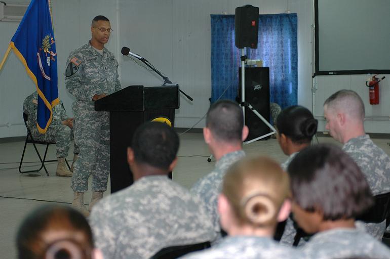 | Keywords: 1st ACB Observes Black History Month DVIDS36452.jpg en Soldiers of the 1st Air Cavalry Brigade 1st Cavalry Division listen as Baton Rouge La native Lt Col Charles Dalcourt Jr speaks about African Americans in the U S military during a Black History Month program at Camp Taji Iraq Feb 15 2004-12-31 Sgt 1st Class Rick Emert https //www dvidshub net/image/36452 36452 2007-02-19 10 39 TAJI IQ PD-USGov Black History Month at Fort Hood Texas Camp Taji Black History Month Images from DoD uploaded by Fæ |