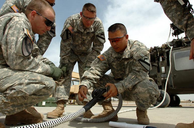Keywords: 1st Air Cavalry Brigade troops ready helo for haul DVIDS44549.jpg en New Orleans native Staff Sgt Quang Nguyen right noncommissioned officer in charge of quality control for Company D 3rd Battalion 227th Aviation Regiment 1st Air Cavalry Brigade 1st Cavalry Division gives a refresher course on how to join two ropes together on the Unit Maintenance Aerial Recovery Kit as Dayton Tenn native William King left a UH-60 Black Hawk crew chief for Company D Glendale Ariz native Brian Lenhart left of Nguyen also a Black Hawk crew chief for Co D and Philadelphia native Chief Warrant Officer Donald Chambers behind King the aviation maintenance technician for Co D listen and watch during an airlift dry run at Camp Taji Iraq It is routine for them to go over every detail well in advance of any airlift to make sure they are ready for the task when it happens said Nguyen 1999-11-30 Staff Sgt Nathan Hoskins https //www dvidshub net/image/44549 44549 2007-05-15 10 10 TAJI IQ PD-USGov UH-60 Black Hawk 1st Cavalry Division United States Camp Taji Images from DoD uploaded by Fæ |