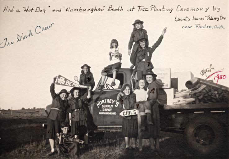 | Keywords: girl guides girlguides north addington northaddington northbrook flinton tree planting treeplanting ceremony lennox & addington lennoxaddington county forest countyforest 1950 alf northey alfnorthey howard northey howardnorthey john l. lloyd johnllloyd joseph ranch josephranch tom killingbeck tomkillingbeck jim freeborn jimfreeborn freeborn's store freebornsstore laura wood laurawood verna rosenplot vernarosenplot billy creighton billycreighton phyllis creighton phylliscreighton carole baker carolebaker joanne mcneill joannemcneill barbara nicholson barbaranicholson hilda woodman hildawoodman shirley rosenplot shirleyrosenplot mary lloyd marylloyd outdoor Here the Girl Guide Company participates in a tree planting ceremony by Lennox & Addington County near Flinton. Pictured here is 'The Work Crew'. Photo on Mary Johnson's camera, snapped by Howard Northey. Further information on the back of the Mary Johnson's photo states: 'We had a hot dog and hamburger booth at the ceremony provided by Township Council in Kaladar. Several local people planted a tree including Magistrate John L. Lloyd and Joseph Yanch. We provided our own stove - kindness of Mrs. Tom Killingbeck in Northbrook. The truck to take us there was through the kindness of Alf Northey on Northbrook. I drove the truck over and Howard Northey drove back! We bought 200 lbs. of ground beef! It was stored in Jim Freeburn's store in their freezer. We were ages getting rid of it including: A. set-up stand when Flinton School held a strike, B. set-up stand on street near the Northbrook Hotel, C. set-up stand outside Cloyne Hall where a dance was on. Left-Right: 1. Laura Wood -holding girl guide motto 'Be Prepared' 2. Verna Rosenplot- holding girl guide motto 3. Billy Creighton - holding Lend a Hand banner 4. Carole Baker 5. Phyllis Creighton- on top of cab 6. Joanne McNeill- top 7. Barbara Nicholson - below Joanne 8. Hilda Woodman 9. Shirley Rosenplot 10. Mary Lloyd - Captain Here the Girl Guide Company participates in a tree planting ceremony by Lennox & Addington County near Flinton. Pictured here is 'The Work Crew'. Photo on Mary Johnson's camera, snapped by Howard Northey. Further information on the back of the Mary Johnson's photo states: 'We had a hot dog and hamburger booth at the ceremony provided by Township Council in Kaladar. Several local people planted a tree including Magistrate John L. Lloyd and Joseph Yanch. We provided our own stove - kindness of Mrs. Tom Killingbeck in Northbrook. The truck to take us there was through the kindness of Alf Northey on Northbrook. I drove the truck over and Howard Northey drove back! We bought 200 lbs. of ground beef! It was stored in Jim Freeburn's store in their freezer. We were ages getting rid of it including: A. set-up stand when Flinton School held a strike, B. set-up stand on street near the Northbrook Hotel, C. set-up stand outside Cloyne Hall where a dance was on. Left-Right: 1. Laura Wood -holding girl guide motto 'Be Prepared' 2. Verna Rosenplot- holding girl guide motto 3. Billy Creighton - holding Lend a Hand banner 4. Carole Baker 5. Phyllis Creighton- on top of cab 6. Joanne McNeill- top 7. Barbara Nicholson - below Joanne 8. Hilda Woodman 9. Shirley Rosenplot 10. Mary Lloyd - Captain |