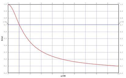 | Keywords: 1st Order Lowpass Filter ARF Lin.svg The amplitude response function of the following 1st-Order Lowpass Filter centre Plotted on linear-linear scales from 0 to 10 units of RC Own drawing Plotted in Mathematica Edited in Inkscape 2007-02-17 Inductiveload Logarithmic Amplitude Response Function Linear Phase Response Function Logarithmic Phase Response Function Mathematica Source This code requires the following packages to be loaded <pre><<Graphics`Graphics`</pre> <pre> lingrid0pos1 Tablea a 0 1 0 1 ; lingrid0pos10 Tablea a 0 10 1 ; root2 1/Sqrt2 ; linxgrid lingrid0pos10; linygrid Unionlingrid0pos1 root2; ampplotlin Plot1/Sqrt1 + ω 2 ω 0 10 PlotRange -> 0 10 0 1 ImageSize -> 800 Frame -> True GridLines -> linxgrid linygrid FrameTicks -> linxgrid linygrid FrameLabel -> ω/CR A ω </pre> Analog signal processing circuit diagrams |