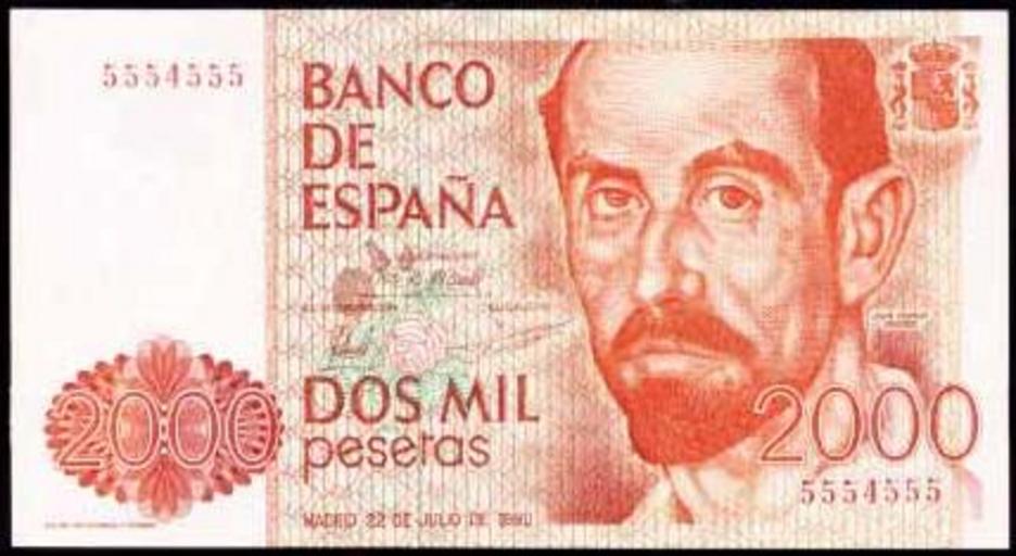 | Keywords: 2000pelas.JPG es 2000 pesetas del 80 Juan Ramon Jimenez own Iu96 GFDL cc-by-3 0 Peseta banknotes Juan Ramón Jiménez Spain in the 1980s Nobel laureates on banknotes Jimenez Juan Ramon 1980 banknotes Red banknotes Banknotes with a face value of 2000 PD-SpanishGov-money |