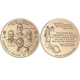 Keywords: 2003 Brown et al. v. the Board of Education of Topeka et al. Congressional Gold Medal.jpg Text info from http //catalog usmint gov/webapp/wcs/stores/servlet/ProductDisplay catalogId 10001 storeId 10001 productId 11002 langId -1 U S Mint Authorized by Public Law 108-180 this medal commemorates Reverend Joseph A DeLaine Harry and Eliza Briggs and Levi Pearson for their contributions to the Nation as pioneers in the effort to desegregate public schools that led directly to the landmark desegregation case of Brown et al v the Board of Education of Topeka et al The medal is a bronze replica of the Congressional Gold Medals awarded posthumously to Reverend Joseph A DeLaine Harry and Eliza Briggs and Levi Pearson and presented to personal representatives of each at a ceremony at the United States Capitol building on September 9 2004 The obverse design features a portrait of Reverend Joseph A DeLaine at the top center of the design Harry Briggs in the right center Eliza Briggs at the lower center and Levi Pearson in the left center of the design Each name is inscribed next to the corresponding image Centered along the top field are the inscriptions BRIGGS v ELLIOTT and Our Trust Is In God Inscribed along the bottom are the words BROWN v BOARD OF EDUCATION Two palm trees flank the images one on the left and one on the right The reverse design features four inscriptions that run from top to bottom Honoring the Pioneers and Petitioners from Clarendon County South Carolina They proved that segregation in education can never produce equality and that it is an evil that must be eradicated Judge J Waties Waring Dissenting Opinion ACT OF CONGRESS 2003 To the left of the inscriptions is a statue of Justitia the Roman goddess of justice portrayed with a pair of balanced scales raised in her left hand and a sword at her side in her right hand In the forefront four books are to be seen http //catalog usmint gov 2003 United States Mint Design Obverse - Charles L Vickers Reverse - Donna Weaver PD PD-USGov Congressional Gold Medals Brown v Board of Education 2003 medals