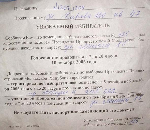 MAKE A MEME View Large Image 2006-pmr-election-invite.jpg Voter invitation card for Transnistria Moldavian Republic Presidential elections 2006 П иглашение для участия в выбо ах П езидента П Р Own 2006-12-10 Роман Ст ...