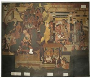 Keywords: 2006AY0603 jpg lajanta Gill.jpg en Copy of painting inside the caves of Ajanta cave 1 ; Copy of painting inside the caves of Ajanta by Robert Gill V A Museum as IS 55-1885 White patches are over sections in need of conservation Original dates to the 470s V A page says Height 2305 mm Width 2740 mm Height 2350 mm with frame Width 2770 mm with frame Depth 40 mm with frame Object history note Commissioned by the Government of India between 1844-1863 and deposited in the India Museum London Historical significance The paintings inside the Ajanta caves tell stories from the lives of the Buddha The main part of this painting depicts scenes from the Janaka jataka The narrative continues onto painting IS 53-1885 Narrative King Janaka of Videha is seen sitting in his palace with his wife He announces to her that he intends to renounce his worldly life Scene depicted in the centre of IS 55-1885 In order to persuade him against this course she organises a music and dance performance Scene depicted in left hand side of IS 53-1885 Despite the pleasure of viewing the dancers the king confirms his decision to live alone According to Schlingloff he is persuaded to do this by the sight of women preparing cotton as the two bangles that one of them is wearing clash together and resound whereas the single bangle of the other women remains silent Scene depicted in bottom centre of IS 55-1885 The king renounces his kingdom and rides out through the city gates on his elephant accompanied by a retinue which includes his son Scene depicted in the centre of IS 53-1885 Once they have left the city the king and his retinue visit a hermit in the mountains and listen to his sermons Here the hermit reassures him that only a life of solitude can lead to salvation Scene depicted in the top right hand corner of IS 53-1885 In the top left hand corner is a scene from the Sankhapala jataka A Bodhisattva having witnessed the splendour of the Naga king wished to be reborn into the Naga kingdom In his next birth he was born as the Naga king Sankhapala He soon grew weary of the good life and as a penance for his desires he lay on an ant hill and offered his body to passers by A party of men found him they tied a rope around him and as they dragged him along Sanhkapala did not resist A kind-hearted cattle dealer who saw what was happening and offered the men some of his cows in exchange for the serpent Scene depicted in top left hand corner The grateful Sankhapala took the cattle dealer to his splendid palace under the lotus-lake where he stayed for a year after which he decided to become an ascetic 2012-10-24 22 51 10 http //collections vam ac uk/item/O115446/copy-of-painting-inside-the-oil-painting-gill-robert/ Robert Gill 2006AY0603 jpg lajanta Gill cropped jpg PD-Art Uploaded with UploadWizard Cave 1 Ajanta Rock paintings of people in the Ajanta Caves Art of India in the Victoria and Albert Museum Robert Gill |