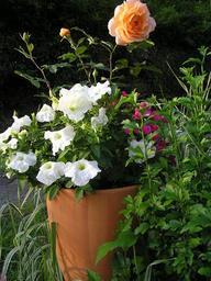 | Keywords: 2007.6.20 ペチュニアとバラの寄せ植え.JPG  2007 6 20 ペチュニアとバラの寄せ植え Terracotta plant pot with large-flowered hybrid rose cultivar and white petunia cultivar between a variegated grass Phalaris arundinacea var picta and hardy hibiscus Hibiscus syriacus not in flower 唐山健志郎 2007-06-20 唐山健志郎 PD White flowers Mixed flowers Apricot roses Petunia × atkinsiana Phalaris arundinacea Hibiscus syriacus |