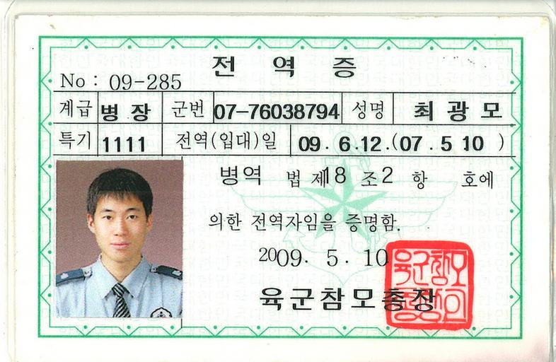 Keywords: 2009년 5월 10일 경기도 남양주소방서 의무소방원 최광모 전역증.png ko 27기 무소방원 광모 전역 광모는 2007년 7월 초 터 2009년 6월 12 까 남양주소방 에 무소방원 근무하며 군복무를 신하 다 2009-05-10 own 광모 other versions cc-zero Uploaded with UploadWizard Choe Kwangmo