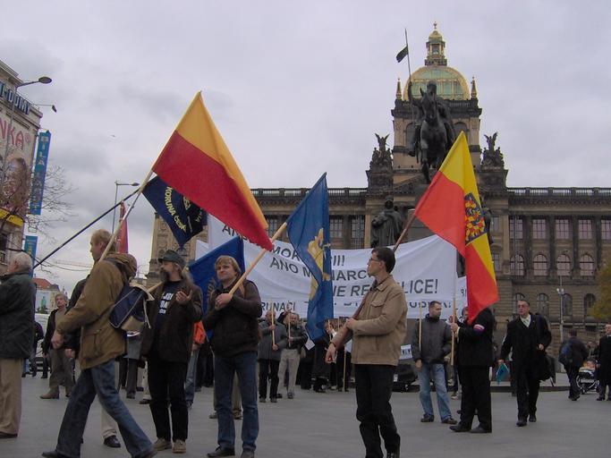 Keywords: 2009 Prague Monarchist Parade 01.JPG Korunou českou en Monarchist Parade in Prague organised by Czech monarchist party Koruna česká own Joker Island 2009-10-28 2009 Prague Monarchist Parade