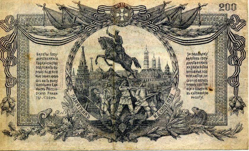 | Keywords: 200 Roubles cossacks 1919.jpg en Russian Don banknote 200 rubles 1919 year ru Банкнота Донской области достоинством 200 ублей об азца 1919 года scanned note from own personal collection П авительство Донской области/Ростовская конто а Госбанка 1919 1919 currency Banknotes of Don 1919 Banknotes with a face value of 200 Horse riding on banknotes Buildings on banknotes Sculptures on banknotes Musical instruments on banknotes | ||||
