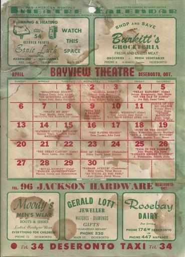 Keywords: 1950s cinemas advertisements text writing Calendar of movies playing at the Bayview [Naylor's] Theatre, Deseronto, Ontario, during April [1952]. Includes advertisements for Ernie Luck's Plumbing & Heating, Burkitt's Groceteria, Moody's Men's Wear, Gerald Lott's Jewellery, and Rosebay Dairy. Movies include Hollywood Story, Illegal Entry, Texas Rangers, That's My Boy, Wing and a Prayer, Royal Wedding, Father's Little Dividend, The Mating Season, Fury of the Congo, The Great Caruso, Bird of Paradise, Tall in the Saddle and Wabash Avenue. One of a number of items found in a house in Brant Street, Deseronto, in 1997. Calendar of movies playing at the Bayview [Naylor's] Theatre, Deseronto, Ontario, during April [1952]. Includes advertisements for Ernie Luck's Plumbing & Heating, Burkitt's Groceteria, Moody's Men's Wear, Gerald Lott's Jewellery, and Rosebay Dairy. Movies include Hollywood Story, Illegal Entry, Texas Rangers, That's My Boy, Wing and a Prayer, Royal Wedding, Father's Little Dividend, The Mating Season, Fury of the Congo, The Great Caruso, Bird of Paradise, Tall in the Saddle and Wabash Avenue. One of a number of items found in a house in Brant Street, Deseronto, in 1997. |