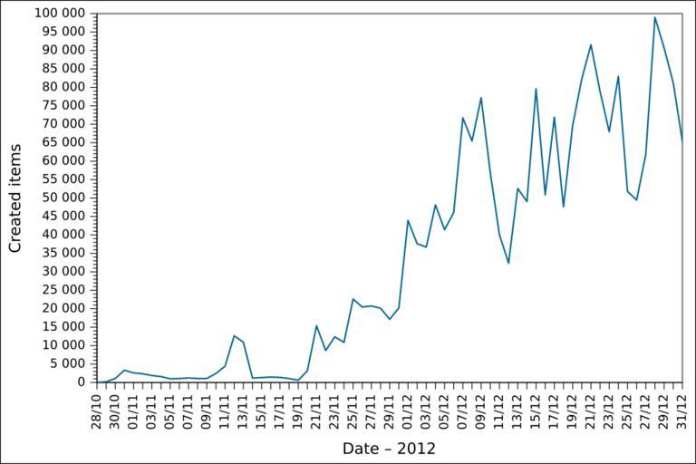 | Keywords: 2012 Wikidata item creation EN.svg de Grafische Darstellung des täglichen Anzahls der im Jahr 2012 angelegten Gegenstände auf Wikidata auf Englisch Löschungen werden nicht berücksichtigt en Graph presenting the number of items created daily on Wikidata in 2012 in English Item deletions are not taken into account fr Graphique en anglais représentant le nombre d'éléments créés par jour sur Wikidata en 2012 Les suppressions d'éléments ne sont pas prises en compte 2013-01-01 17 34 35 own Ljubinka cc-zero de inline yes File 2012 Wikidata item creation DE svg fr inline yes File 2012 Wikidata item creation FR svg Wikidata statistics in 2012 Wikidata statistics in English |