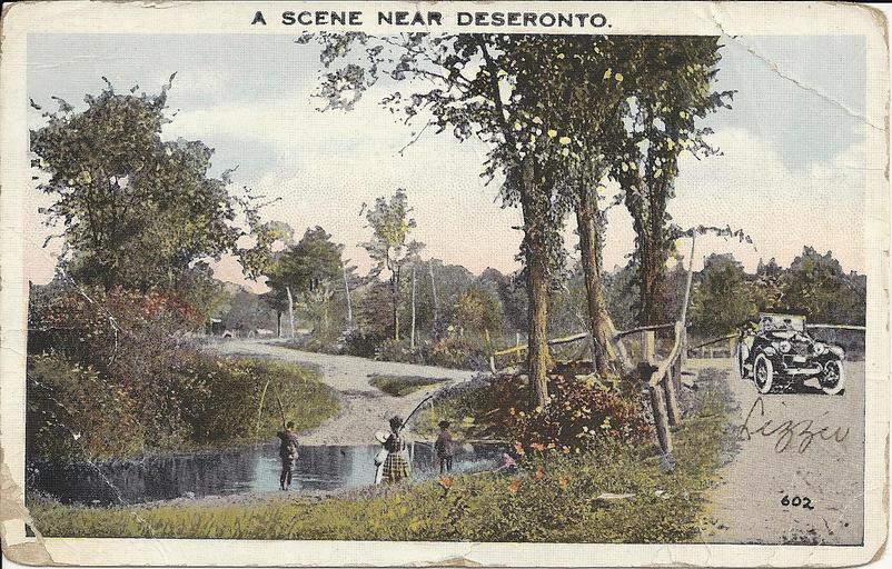 | Keywords: 1920s cars trees roads outdoor photo border Coloured postcard depicting "a scene near Deseronto", Ontario. Four people are fishing next to a bridge on which there is a car. The name "Lizzie" has been written underneath the car. Reverse of this postcard. Coloured postcard depicting "a scene near Deseronto", Ontario. Four people are fishing next to a bridge on which there is a car. The name "Lizzie" has been written underneath the car. Reverse of this postcard. |