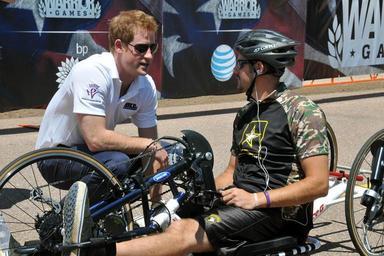 | Keywords: 2013 Warrior Games 130512-D-SC123-002.jpg en Prince Harry offers words of encouragement to Army veteran Blake McInn before the start of the 2013 Warrior Games recumbent bike cycling competition near the U S Air Force Academy in Colorado Springs Colo May 11 From May 11-16 more than 200 wounded ill and injured servicemembers and veterans from the U S Marines Army Air Force and Navy as well as a team representing U S Special Operations Command and an international team representing the United Kingdom will compete for the gold in track and field shooting swimming cycling archery wheelchair basketball and sitting volleyball at the U S Olympic Training Center and U S Air Force Academy The military service with the most medals will win the Chairman's Cup 2013-05-11 Shannon Collins https //www dvidshub net/image/931292 130512-D-SC123-002 2013-05-14 14 21 COLORADO SPRINGS CO US PD-USGov Prince Harry of Wales U S Olympic Training Center Images from DoD uploaded by Fæ |