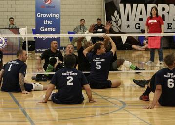 | Keywords: 2013 Warrior Games Seated Volleyball 130414-N-DT940-456.jpg en Team Navy/Coast Guard members watch the direction of the ball in a game of seated volleyball against Team Army during the 2013 Warrior Games May 14 The Warrior Games includes competitions in archery cycling seated volleyball shooting swimming track and field and wheelchair basketball The goal of the Warrior Games is not necessarily to identify the most skilled athletes but rather to demonstrate the incredible potential of wounded warriors through competitive sports More than 200 wounded ill or injured service members from the U S and U K armed forces are scheduled to compete in the Paralympics-style competition May 11-16 U S Navy photo by Mass Communication Specialist 1st Class Erica R Gardner/Released 2013-05-14 Petty Officer 1st Class Erica R Gardner https //www dvidshub net/image/932381 130414-N-DT940-456 2013-05-15 13 52 COLORADO SPRINGS CO US PD-USGov-Military-Navy 2013 Warrior Games Images from DoD uploaded by Fæ |