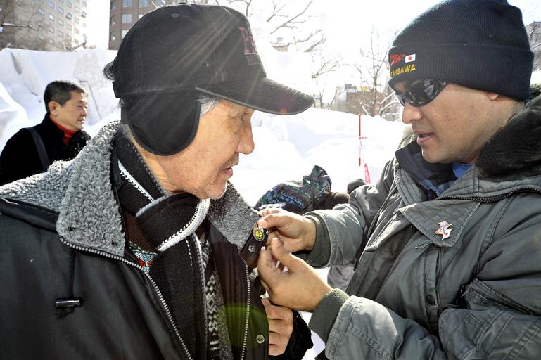 Keywords: 2014 Navy Misawa Snow Team at 65th Annual Sapporo Snow Festival 140206-N-ZI955-129.jpg en Chief Builder Billy Harger helps an elderly man place a Commander Naval Forces Japan lapel pin on his jacket during the 65th Annual Sapporo Snow Festival Feb 6 2014 Harger is the team leader of the 2014 Navy Misawa Snow Sculpture Team which is on Hokkaido Island Japan taking part in the festival The team sculpted a frosty 3-D version of the U S Navy Seabee's Fighting Bee logo This is the 31st year that Naval Air Facility Misawa and its tenant commands have sent a delegation of sailors to Sapporo to create a sculpture and to serve as U S Navy goodwill ambassadors The festival draws about two million spectators each year U S Navy photo by Senior Chief Mass Communication Specialist Daniel Sanford/Released <br>Unit Naval Air Facility Misawa 2014-02-06 Senior Chief Petty Officer Daniel Sanford https //www dvidshub net/image/1162158/2014-navy-misawa-snow-team-65th-annual-sapporo-snow-festival 140206-N-ZI955-129 2014-02-06 03 31 SAPPORO HOKKAIDO JP PD-USGov-Military-Navy Naval Air Facility Misawa Images from DoD uploaded by Fæ |