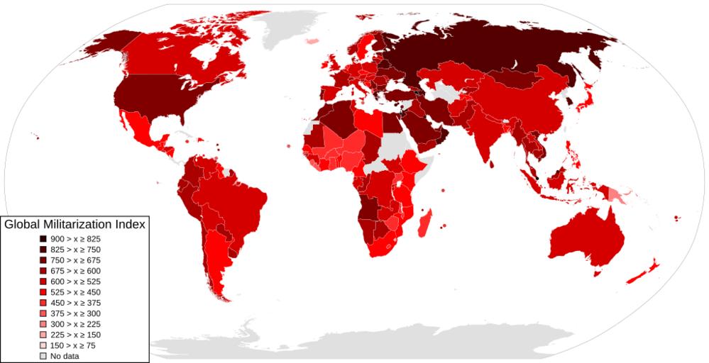 | Keywords: 2014 world map of countries by Global Militarization Index.svg Editor's note This map is saved in human-editable plain text format to make updating easier for everyone Save and open with Notepad and simply cut and paste the country code from one class to another when updating then save and upload with a new file name for that year Robinson projection SVG map of world countries shaded by their Global Militarization Index for the year 2014; a measure of the weight and importance of a country's military to the society http //gmi bicc de/index php page ranking-table year 2014 BICC 2014 2015-12-04 Jolly Janner <gallery> File 2014 world map of countries by Global Militarization Index svg Global Militarization Index File 2014 world map of countries by Military Expenditure Index svg Military Expenditure Index File 2014 world map of countries by Military Personnel Index svg Military Personnel Index File 2014 world map of countries by Heavy Weapons Index svg Heavy Weapons Index </gallery> Militarization index maps of the world |