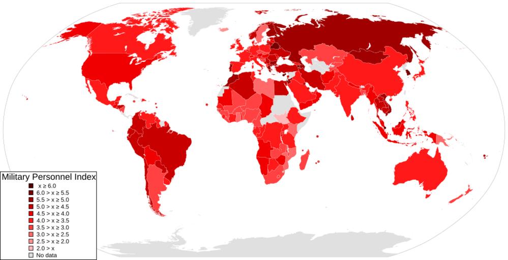 | Keywords: 2014 world map of countries by Military Personnel Index.svg Editor's note This map is saved in human-editable plain text format to make updating easier for everyone Save and open with Notepad and simply cut and paste the country code from one class to another when updating then save and upload with a new file name for that year Robinson projection SVG map of world countries shaded by their Military Expenditure Index for the year 2014; a contrast between military and paramilitary personnel with population and number of physicians http //gmi bicc de/index php page ranking-table year 2014 BICC 2014 2015-12-06 Jolly Janner <gallery> File 2014 world map of countries by Global Militarization Index svg Global Militarization Index File 2014 world map of countries by Military Expenditure Index svg Military Expenditure Index File 2014 world map of countries by Military Personnel Index svg Military Personnel Index File 2014 world map of countries by Heavy Weapons Index svg Heavy Weapons Index </gallery> Militarization index maps of the world |