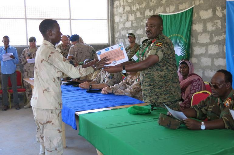 Keywords: Brigadier Sam Kavuma (right) the Acting Force Commander and Commander of the Ugandan contingent in Somalia hands over a certificate of completion to one of the Somalia National Army soldiers who completed a three months training in military intelligence and Non-Commissioned Officers' course on 25 March 2015. AMISOM Photo / Raymond Baguma Brigadier Sam Kavuma (right) the Acting Force Commander and Commander of the Ugandan contingent in Somalia hands over a certificate of completion to one of the Somalia National Army soldiers who completed a three months training in military intelligence and Non-Commissioned Officers' course on 25 March 2015. AMISOM Photo / Raymond Baguma 2015 03 25 SNA PASSOUT-7 (16739093880).jpg en Brigadier Sam Kavuma right the Acting Force Commander and Commander of the Ugandan contingent in Somalia hands over a certificate of completion to one of the Somalia National Army soldiers who completed a three months training in military intelligence and Non-Commissioned Officers' course on 25 March 2015 AMISOM Photo / Raymond Baguma 2015-03-25 11 22 05 https //www flickr com/photos/au_unistphotostream/16739093880/ Flickr en AMISOM Public Information AMISOM Public Information https //flickr com/photos/61765479 N08/16739093880 2015-11-28 09 08 05 cc-zero cc-0 Photographs by the African Union Mission to Somalia Sam Kavuma Brigadier Sam Kavuma (right) the Acting Force Commander and Commander of the Ugandan contingent in Somalia hands over a certificate of completion to one of the Somalia National Army soldiers who completed a three months training in military intelligence and Non-Commissioned Officers' course on 25 March 2015. AMISOM Photo / Raymond Baguma |