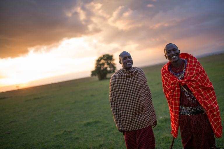 Keywords: kenya travel tourism culture tradition maasai mara national reserve north conservancy wildlife conservation walking village manyatta traditional contemporary lifestyles modern world 21st century change development outdoor KENYA, Maasai Mara: In a photograph taken by Make It Kenya 23 June 2015, Josphat Mako (right) Maasai guide and companion to author and travel writer Stuart Butler, stands with a Maasai companion known as Lemeria as the sun begins to set over the Mara North Conservancy adjacent to Kenya's world famous Maasai Mara National Reserve. Throughout the months of May and June, Stuart and Mako walked over 200km across traditional lands belonging to Kenya's Maasai. Embarking from the high, remote and forested Loita Hills they headed west, skirting the edge of the world famous Maasai Mara National Reserve, passing through private and community conservancies before finishing at the foot of the Oloololo Escarpment. During the expedition, Stuart and Mako visited numerous Maasai villages known as manyattas spending time with both past and present generations of Maasai people, learning about their traditional cultures and contemporary Maasai lifestyles, and the pressure of the modern world and the 21st Century, conservation, political pressures and tourism, all of which influence and contribute to Maasai life today. MANDATORY CREDIT: MAKE IT KENYA PHOTO / STUART PRICE. KENYA, Maasai Mara: In a photograph taken by Make It Kenya 23 June 2015, Josphat Mako (right) Maasai guide and companion to author and travel writer Stuart Butler, stands with a Maasai companion known as Lemeria as the sun begins to set over the Mara North Conservancy adjacent to Kenya's world famous Maasai Mara National Reserve. Throughout the months of May and June, Stuart and Mako walked over 200km across traditional lands belonging to Kenya's Maasai. Embarking from the high, remote and forested Loita Hills they headed west, skirting the edge of the world famous Maasai Mara National Reserve, passing through private and community conservancies before finishing at the foot of the Oloololo Escarpment. During the expedition, Stuart and Mako visited numerous Maasai villages known as manyattas spending time with both past and present generations of Maasai people, learning about their traditional cultures and contemporary Maasai lifestyles, and the pressure of the modern world and the 21st Century, conservation, political pressures and tourism, all of which influence and contribute to Maasai life today. MANDATORY CREDIT: MAKE IT KENYA PHOTO / STUART PRICE.