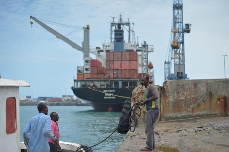 Keywords: outdoor A Somali man helps dock a smaller boat in Mogadishu's port on September 17, 2005, while a much larger container ship gets off loaded in the background. AMISOM Photo / Tobin Jones A Somali man helps dock a smaller boat in Mogadishu's port on September 17, 2005, while a much larger container ship gets off loaded in the background. AMISOM Photo / Tobin Jones |