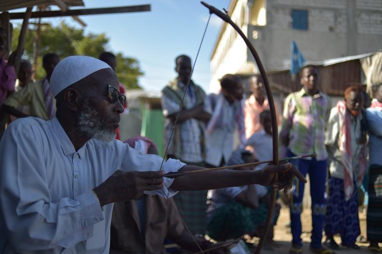 | Keywords: outdoor A man readies his bow and arrow during an archery competition in Mogadishu, Somalia, on September 18. Archery, a traditional sport in Somalia, is still practiced in the country and competitions are regularly held in which men compete to see who is the best at hitting a predetermined target. AMISOM Photo / Tobin Jones A man readies his bow and arrow during an archery competition in Mogadishu, Somalia, on September 18. Archery, a traditional sport in Somalia, is still practiced in the country and competitions are regularly held in which men compete to see who is the best at hitting a predetermined target. AMISOM Photo / Tobin Jones |