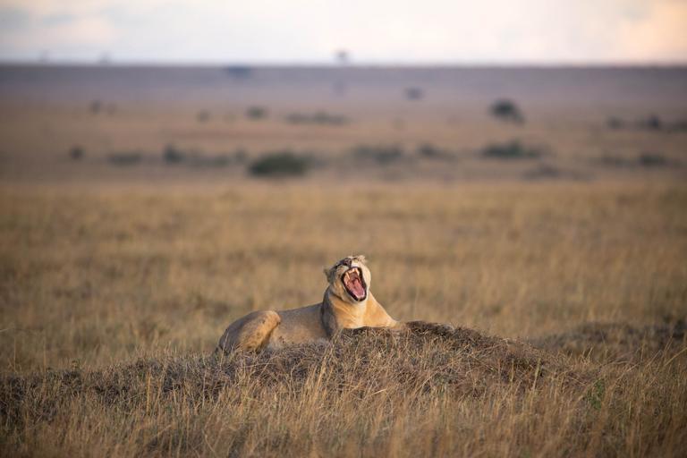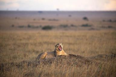 Keywords: outdoor animal KENYA, Masai Mara: In a photograph taken by Make It Kenya 29 September 2015, a lioness from a group of lions known as the Marsh Pride, made famous by wildlife film-makers Jonathan and Angela Scott in the BBC natural history serialisation Big Cat Diary, yawns while sitting on top of an earth mound late in the afternoon in Kenya's Masai Mara National Reserve. During the months of July through to October, one of nature's greatest events takes place in the Mara when hundreds of thousands of wildebeest, zebra and other ungulates migrate northwards from Tanzania's Serengeti in search of fresh pasture and grazing, before turning and heading south again in a journey that covers thousands of kilometres and is known as one of the seven natural wonders of the world, making it a major draw for wildlife enthusiasts and tourists from around the globe. MANDATORY CREDIT: MAKE IT KENYA PHOTO / STUART PRICE. KENYA, Masai Mara: In a photograph taken by Make It Kenya 29 September 2015, a lioness from a group of lions known as the Marsh Pride, made famous by wildlife film-makers Jonathan and Angela Scott in the BBC natural history serialisation Big Cat Diary, yawns while sitting on top of an earth mound late in the afternoon in Kenya's Masai Mara National Reserve. During the months of July through to October, one of nature's greatest events takes place in the Mara when hundreds of thousands of wildebeest, zebra and other ungulates migrate northwards from Tanzania's Serengeti in search of fresh pasture and grazing, before turning and heading south again in a journey that covers thousands of kilometres and is known as one of the seven natural wonders of the world, making it a major draw for wildlife enthusiasts and tourists from around the globe. MANDATORY CREDIT: MAKE IT KENYA PHOTO / STUART PRICE.