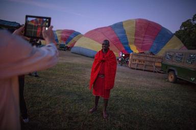 Keywords: KENYA, Masai Mara: In a photograph taken by Make It Kenya 30 September 2015, Moses Kaleku, head guide from the Safari Collection's Sala's Camp poses for a photograph taken on a tablet computer as a Governor's Balloon Safari is inflated with air for a flight over the Masai Mara National Reserve. Seeing the Mara from the air requires an early start in order to be airborne for the sunrise, but offers tourists visiting the famous wildlife reserve a unique and panoramic way to view one of Kenya's most famous natural attractions from the basket of a hot air balloon. MANDATORY CREDIT: MAKE IT KENYA PHOTO / STUART PRICE. KENYA, Masai Mara: In a photograph taken by Make It Kenya 30 September 2015, Moses Kaleku, head guide from the Safari Collection's Sala's Camp poses for a photograph taken on a tablet computer as a Governor's Balloon Safari is inflated with air for a flight over the Masai Mara National Reserve. Seeing the Mara from the air requires an early start in order to be airborne for the sunrise, but offers tourists visiting the famous wildlife reserve a unique and panoramic way to view one of Kenya's most famous natural attractions from the basket of a hot air balloon. MANDATORY CREDIT: MAKE IT KENYA PHOTO / STUART PRICE. |