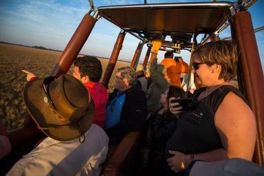 Keywords: KENYA, Masai Mara: In a photograph taken by Make It Kenya 02 October 2015, tourists take photographs and look out from the basket of a Governor's Balloon Safari hot air balloon as it floats along the course of the Mara River just after sunrise. Seeing the Mara from the air requires an early start in order to be airborne for the sunrise, but offers tourists visiting the famous wildlife reserve a unique and panoramic way to view one of Kenya's most famous natural attractions from the basket of a hot air balloon. MANDATORY CREDIT: MAKE IT KENYA PHOTO / STUART PRICE. KENYA, Masai Mara: In a photograph taken by Make It Kenya 02 October 2015, tourists take photographs and look out from the basket of a Governor's Balloon Safari hot air balloon as it floats along the course of the Mara River just after sunrise. Seeing the Mara from the air requires an early start in order to be airborne for the sunrise, but offers tourists visiting the famous wildlife reserve a unique and panoramic way to view one of Kenya's most famous natural attractions from the basket of a hot air balloon. MANDATORY CREDIT: MAKE IT KENYA PHOTO / STUART PRICE.