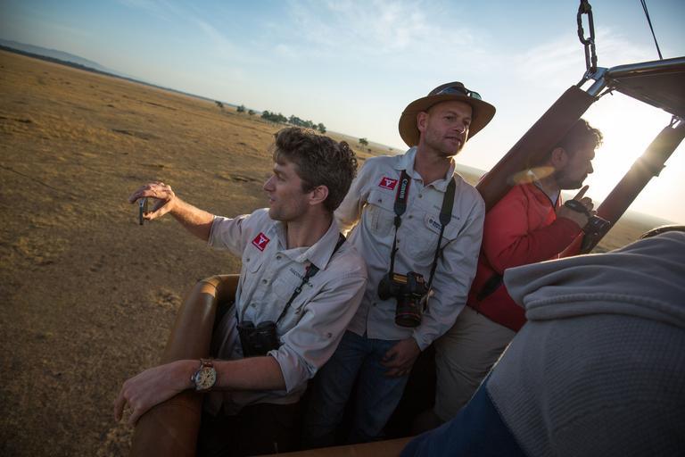 | Keywords: KENYA, Masai Mara: In a photograph taken by Make It Kenya 02 October 2015, Andre Van Kets (left) and Carel Verheof, Co-founders of the website discoverafrica.com/herdtracker, and resource that tracks the annual wildebeest migration in Kenya's Masai Nara National Reserve and Tanzania's Serengeti, live-streams video over the internet via the Twitter application Periscope as a Governor's Balloon Safari floats along the course of the Mara River. Seeing the Mara from the air requires an early start in order to be airborne for the sunrise, but offers tourists visiting the famous wildlife reserve a unique and panoramic way to view one of Kenya's most famous natural attractions from the basket of a hot air balloon. MANDATORY CREDIT: MAKE IT KENYA PHOTO / STUART PRICE. KENYA, Masai Mara: In a photograph taken by Make It Kenya 02 October 2015, Andre Van Kets (left) and Carel Verheof, Co-founders of the website discoverafrica.com/herdtracker, and resource that tracks the annual wildebeest migration in Kenya's Masai Nara National Reserve and Tanzania's Serengeti, live-streams video over the internet via the Twitter application Periscope as a Governor's Balloon Safari floats along the course of the Mara River. Seeing the Mara from the air requires an early start in order to be airborne for the sunrise, but offers tourists visiting the famous wildlife reserve a unique and panoramic way to view one of Kenya's most famous natural attractions from the basket of a hot air balloon. MANDATORY CREDIT: MAKE IT KENYA PHOTO / STUART PRICE. |