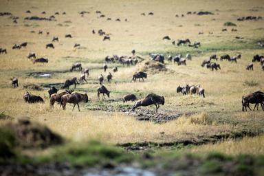 Keywords: outdoor landscape field grassland KENYA, Masai Mara: In a photograph taken by Make It Kenya 03 October 2015, herds of wildebeest are seen scattered across the savannah below the Oloololo Escarpment in the Mara Triangle, part of Kenya's wider Masai Mara ecosystem. During the months of July through to October, one of nature's greatest events takes place in the Mara when hundreds of thousands of wildebeest, zebra and other ungulates migrate northwards from Tanzania's Serengeti in search of fresh pasture and grazing, before turning and heading south again in a journey that covers thousands of kilometres and is known as one of the seven natural wonders of the world, making it a major draw for wildlife enthusiasts and tourists from around the globe. MANDATORY CREDIT: MAKE IT KENYA PHOTO / STUART PRICE. KENYA, Masai Mara: In a photograph taken by Make It Kenya 03 October 2015, herds of wildebeest are seen scattered across the savannah below the Oloololo Escarpment in the Mara Triangle, part of Kenya's wider Masai Mara ecosystem. During the months of July through to October, one of nature's greatest events takes place in the Mara when hundreds of thousands of wildebeest, zebra and other ungulates migrate northwards from Tanzania's Serengeti in search of fresh pasture and grazing, before turning and heading south again in a journey that covers thousands of kilometres and is known as one of the seven natural wonders of the world, making it a major draw for wildlife enthusiasts and tourists from around the globe. MANDATORY CREDIT: MAKE IT KENYA PHOTO / STUART PRICE.