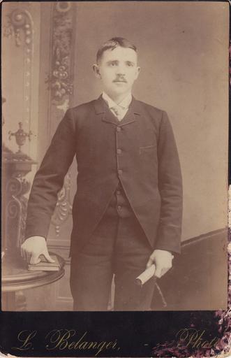 | Keywords: portraits men clothes 1880s Photographic portrait of James Gaulin, taken by L. Belanger, photographer. Possibly a graduation photograph. Gaulin was the postmaster in Deseronto in the first 20 years of the twentieth century. He was born on May 1st, 1870 and died in his residence on the corner of St. George Street and Thomas Street on June 2nd, 1920. Loaned for scanning by Gaulin's grand-daughter, Marie McCartney in August 2015. Photographic portrait of James Gaulin, taken by L. Belanger, photographer. Possibly a graduation photograph. Gaulin was the postmaster in Deseronto in the first 20 years of the twentieth century. He was born on May 1st, 1870 and died in his residence on the corner of St. George Street and Thomas Street on June 2nd, 1920. Loaned for scanning by Gaulin's grand-daughter, Marie McCartney in August 2015. |