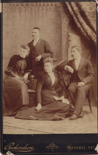 Keywords: 1890s portraits men women clothes Photographic portrait of James Gaulin and his wife, Elizabeth Jane Nealon (on left). Possibly taken on their wedding day: they married on January 19th, 1892 in Napanee. The other two people could be the witnesses to their marriage, Mary Flood and Edward Gaulin (James's brother), both of Deseronto, Ontario. The photograph was taken by Richardson of Napanee, Ontario. Gaulin was the postmaster in Deseronto in the first 20 years of the twentieth century. He was born on May 1st, 1870 and died in his residence on the corner of St. George Street and Thomas Street on June 2nd, 1920. Loaned for scanning by Gaulin's grand-daughter, Marie McCartney in August 2015. Photographic portrait of James Gaulin and his wife, Elizabeth Jane Nealon (on left). Possibly taken on their wedding day: they married on January 19th, 1892 in Napanee. The other two people could be the witnesses to their marriage, Mary Flood and Edward Gaulin (James's brother), both of Deseronto, Ontario. The photograph was taken by Richardson of Napanee, Ontario. Gaulin was the postmaster in Deseronto in the first 20 years of the twentieth century. He was born on May 1st, 1870 and died in his residence on the corner of St. George Street and Thomas Street on June 2nd, 1920. Loaned for scanning by Gaulin's grand-daughter, Marie McCartney in August 2015. |