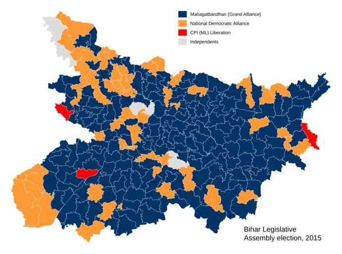 Keywords: 2015 Bihar election result by alliance.svg en A map showing the results of the Bihar Legislative Assembly election 2015 2015-11-08 own Created using data from http //gisserver1 nic in/ecimaps/Biharac aspx Nirinsanity other versions 2015 Bihar election result by alliance Tamil svg Tamil version cc-zero Election maps of Bihar Uploaded with UploadWizard