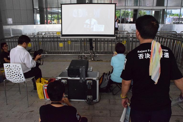 | Keywords: 2015 Hong Kong electoral reform opponents.jpg zh-hk 反對政改的集 人士 立法 大樓外收 議直播 2015-06-18 http //www voacantonese com/media/photogallery/hong-kong-legislature-vetos-government-bill-for-2017-chief-elections/2827650 html Creator Iris Tong other versions Custom license marker 2015 06 20 PD-USGov-VOA Uploaded with UploadWizard 2015 Hong Kong electoral reform voting |