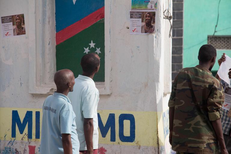 Keywords: Men look at a campaign poster for Subeyda Maxamed Malak Mukhtar, an aspirant for the Federal Lower House of Parliament, in Baidoa, Somalia on September 21, 2016. AMISOM Photo/ Sabir Olad Men look at a campaign poster for Subeyda Maxamed Malak Mukhtar, an aspirant for the Federal Lower House of Parliament, in Baidoa, Somalia on September 21, 2016. AMISOM Photo/ Sabir Olad |